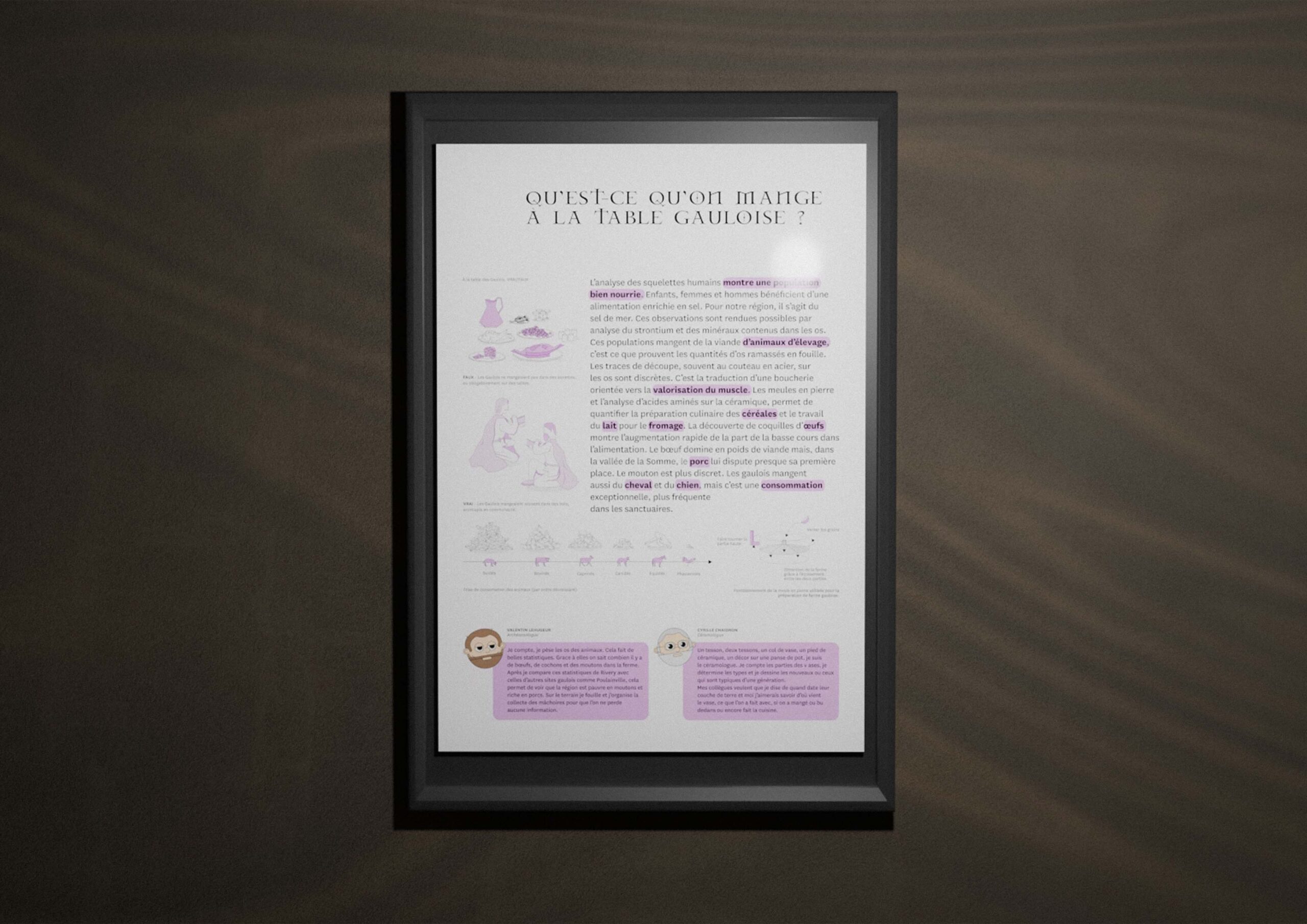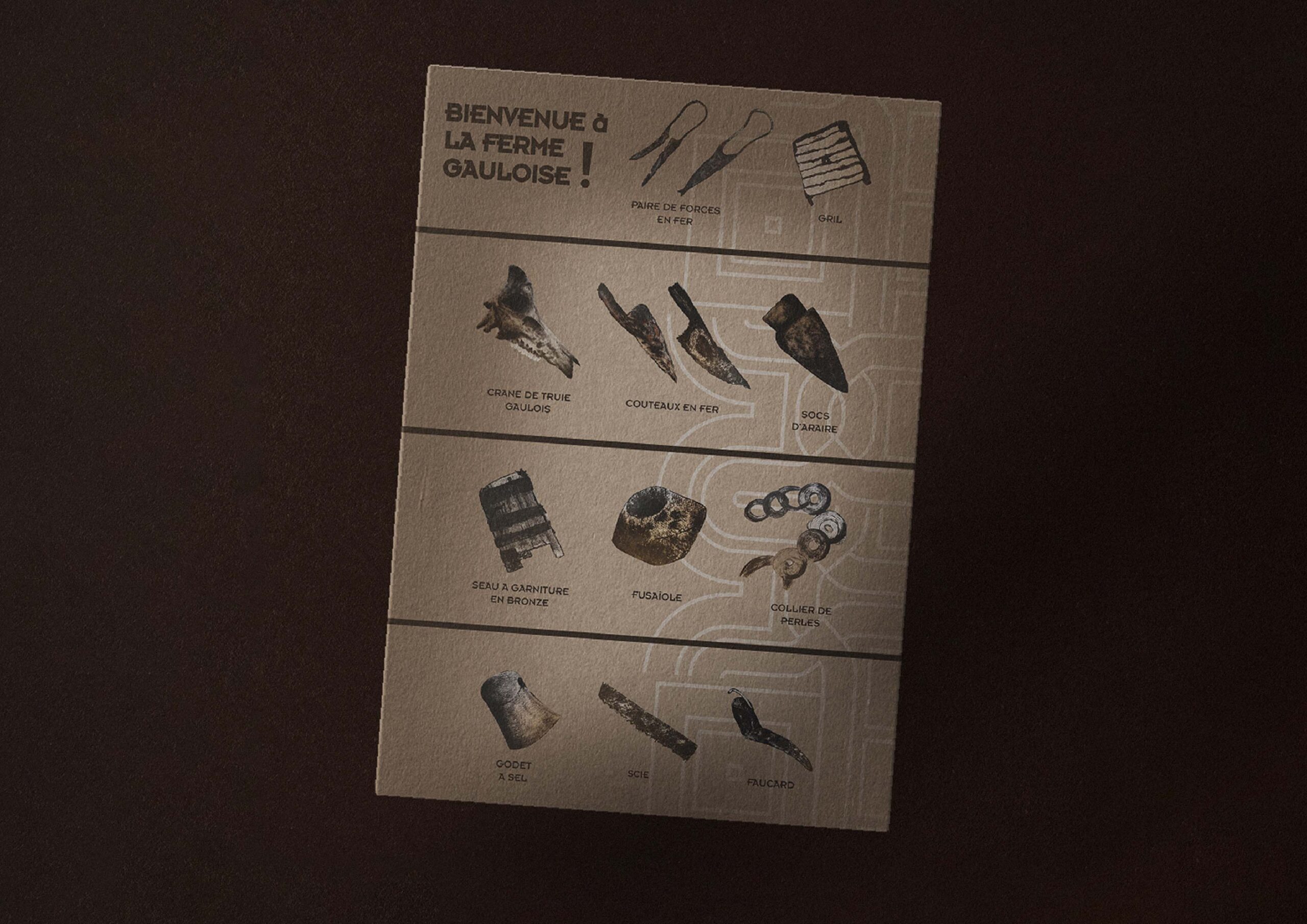 Avec un autre graphiste du nom d’Arthur Guinet, il nous a été demandé de faire un travail de synthèse des informations en les illustrant sous forme schématique. Ainsi notre panneau permet une prise d’informations facilitée pour l’ensemble du public, des plus connaisseurs aux plus jeunes. Il nous a également été demandé de produire un poster qui met en valeur des photos d'objets issu du rapport de fouilles.